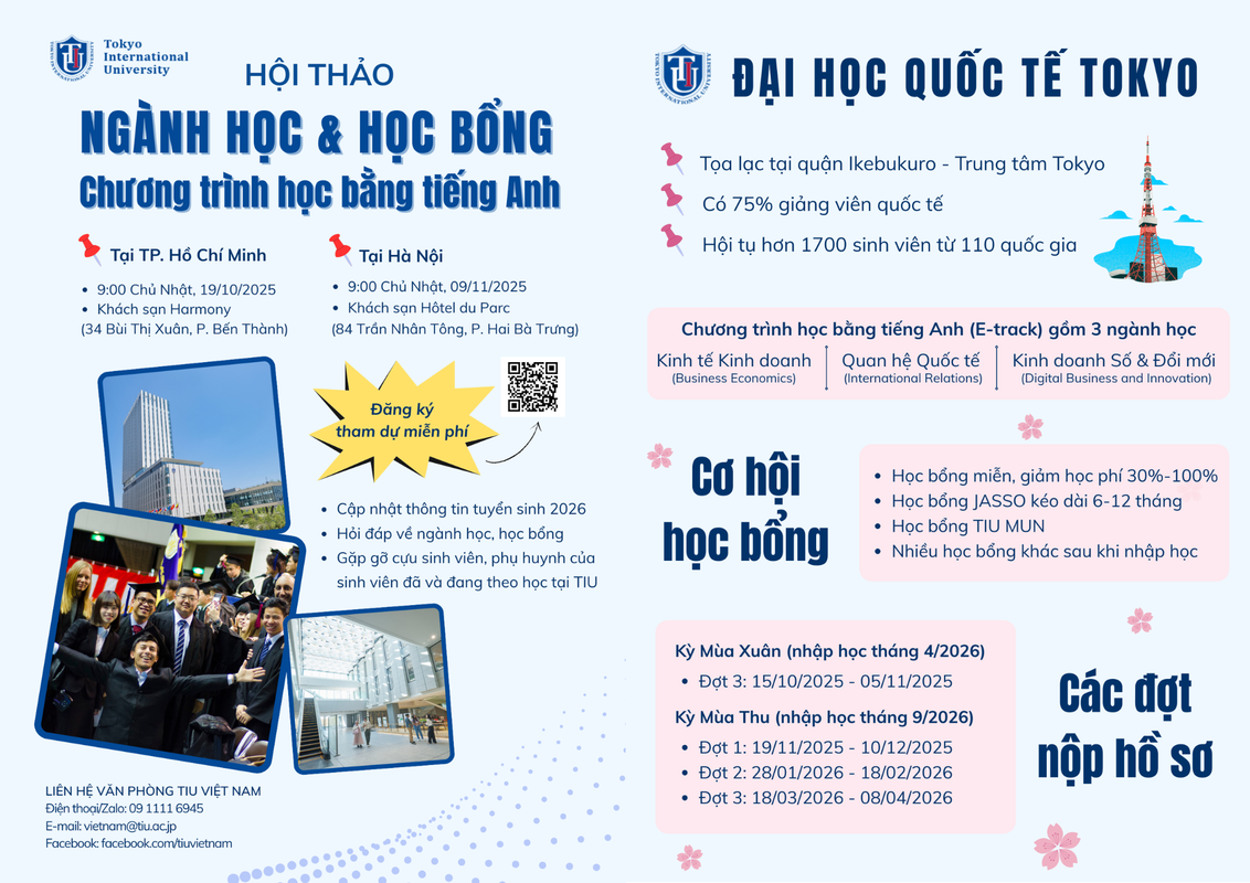 Tháng 11 tới đây, Đại học Quốc tế Tokyo bắt đầu tuyển sinh cho kỳ học Mùa Thu, nhập học tháng 9/2026 với các đợt nộp hồ sơ dành cho học sinh lớp 12. Để kịp thời thông tin tới học sinh, Đại học Quốc tế Tokyo tổ chức Hội thảo “Ngành học và Học bổng của Đại học Quốc tế Tokyo (Chương trình đào tạo bằng tiếng Anh)”. Hội thảo sẽ cung cấp đầy đủ và chi tiết các thông tin về chương trình học, học bổng, cách thức nộp hồ sơ…